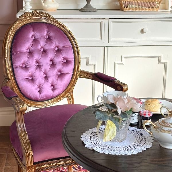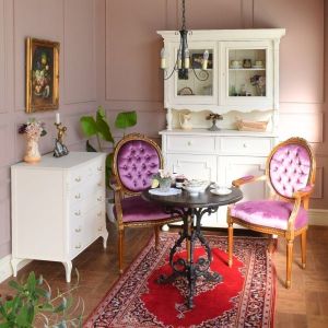 真っ白のカップボードとチェストに組み合わせたのは、存在感が大きなパープル色のフレンチチェア。椅子の色に負けないように真っ赤なペルシャ絨毯を合わせました。