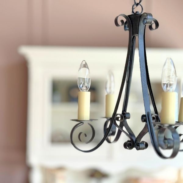 間に目立たないようにアイアン脚のパブテーブルを置いて、同じく黒いアイアンのシャンデリアを吊り下げて完成。話に花が咲きそうです。