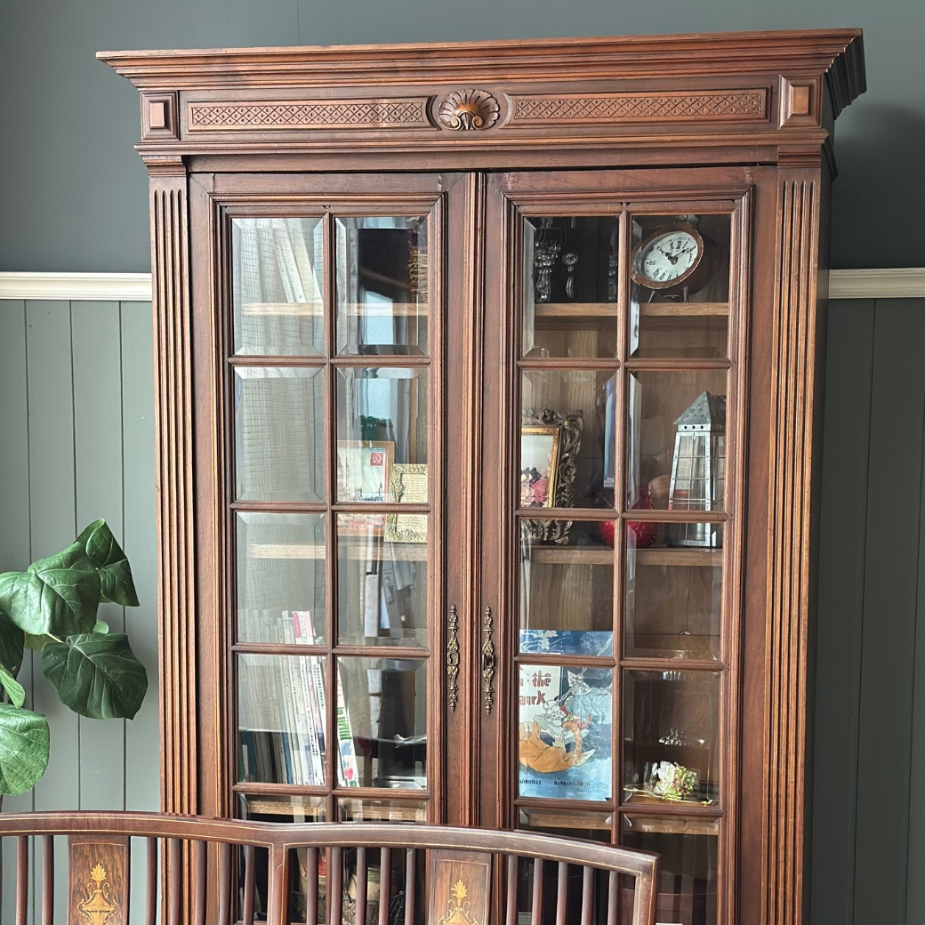 フランスから届いたアンティークガラスのキャビネット、浮き彫りがおしゃれなオーク材のブックケース