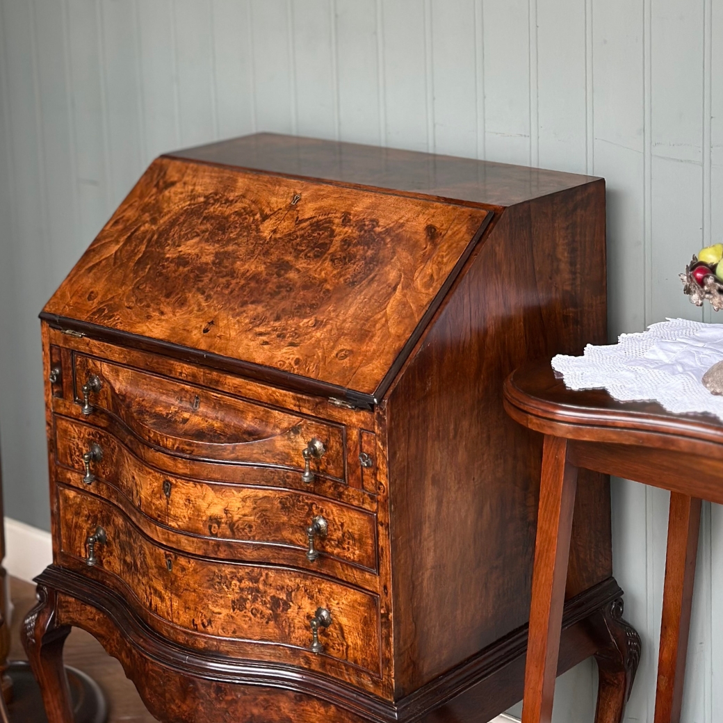 ウォールナット材の木目が輝く英国のアンティークデスク、イギリスから届いた猫足のライティングビューロー