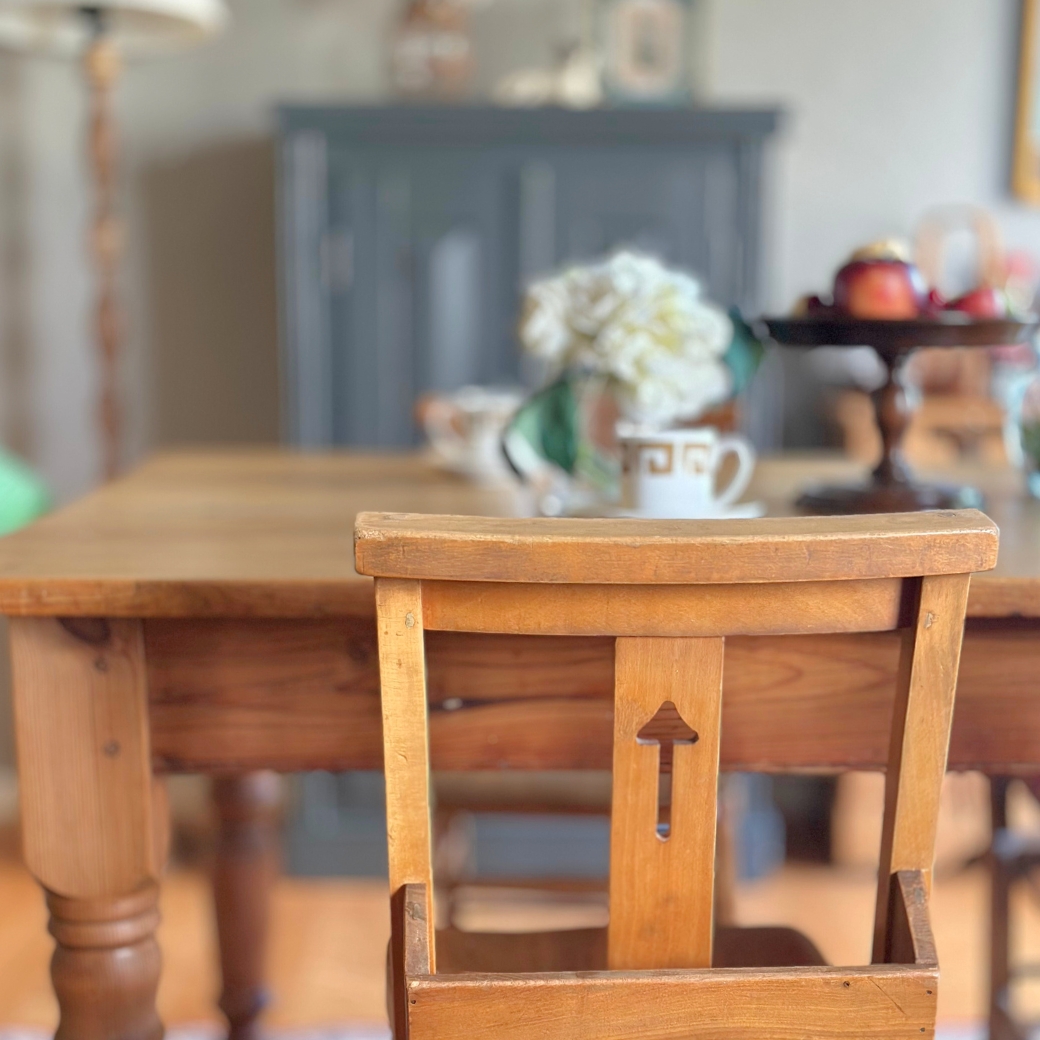 私の初めてのアンティーク、チャーチチェアとオールドパイン材のテーブルを組合わせたダイニングの真ん中に、オーク材のコンポートを置いてフルーツとチョコレートを。