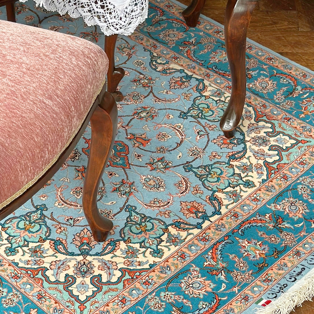 爽やかな青いイスファハーンのペルシャ絨毯、シルクとウールが美しいトキャニのカーペット