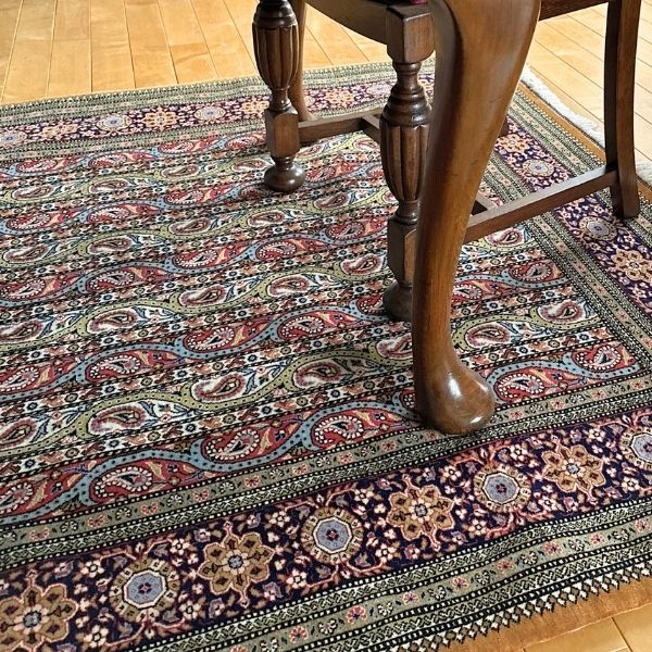 ペイズリーの模様が美しい豪華なペルシャ絨毯、クム(Qum)で織られたポテデザインのビンテージラグ