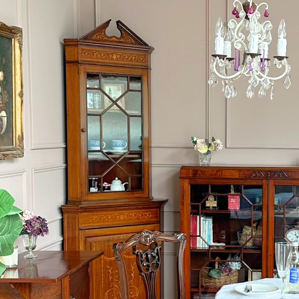 今日のテーマはシノワズリ。シノワズリスタイルのガラスキャビネット&コーナーキャビネットを並べて置いて、ティーテーブルとサロンチェアを組合わせたサロンセットを。