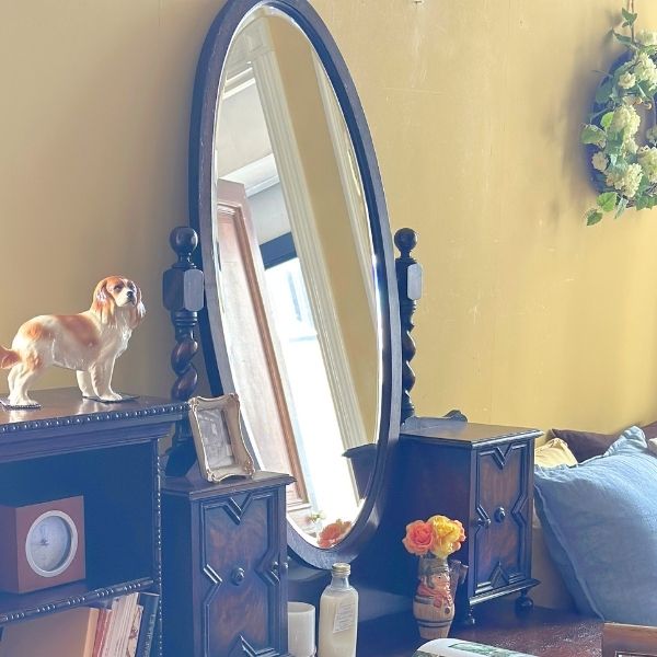 オーバル型のミラーがついたおしゃれなドレッサー、ツイストが美しい英国アンティークのドレッシングチェスト