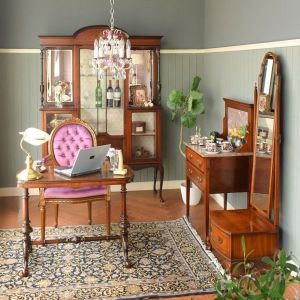 お部屋の真ん中にプレジデントデスクとしてホールテーブルをドーンと置いて、背面の壁にはマホガニーのパーラーキャビネットを。お茶を淹れるカウンターとして、ウォッシュスタンドをサイドに設置しました。