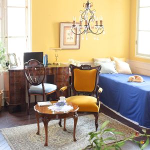 ツヤッツヤの木目が美しいデスクに組み合わせたのは、大好きなヘップルホワイトチェア。お花の形をしたコーヒーテーブルと、アールヌーボーデザインのナーシングチェアを組合わせて、散歩で疲れた体を癒すコーナーを作ってみました。