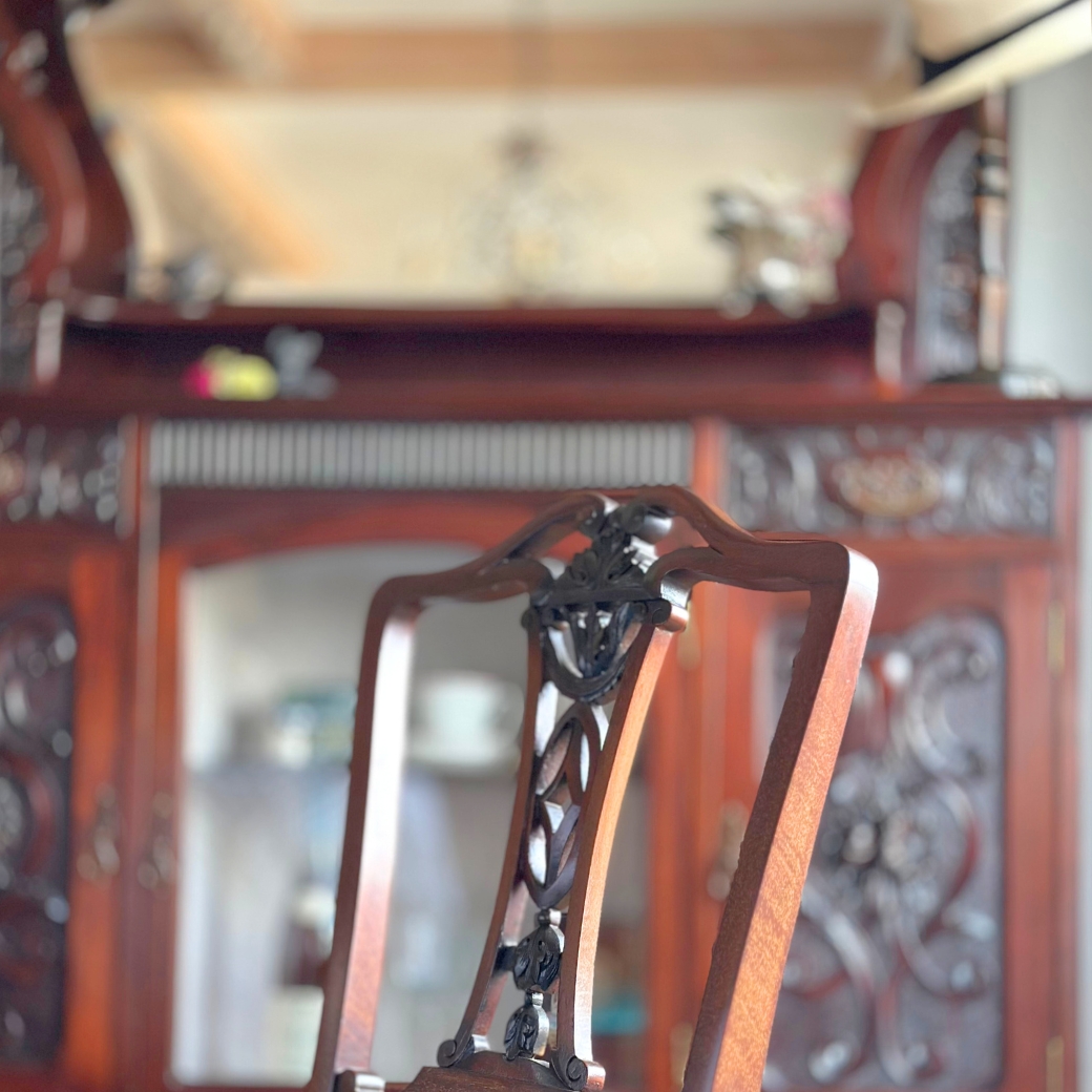 ビクトリアンスタイルの華やかなアンティーク家具、浮き彫りの装飾が美しいパーラーキャビネット