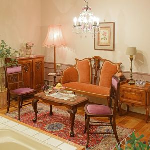 こういう時は、やっぱりピンクが落ち着きそうだなと思って、象嵌が美しいセティを中心に。サイドにはワインテーブルとフロアランプが一体化した、ズボラな私にピッタリすぎるテーブルライトを。