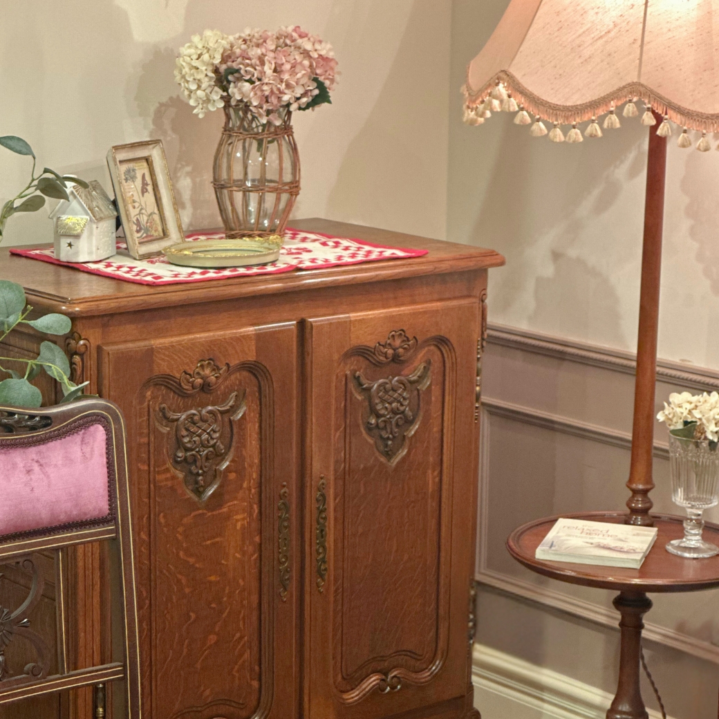 お花の彫刻が可愛いアンティークのキャビネット、大きなミラーが付いたミラーバックサイドボード