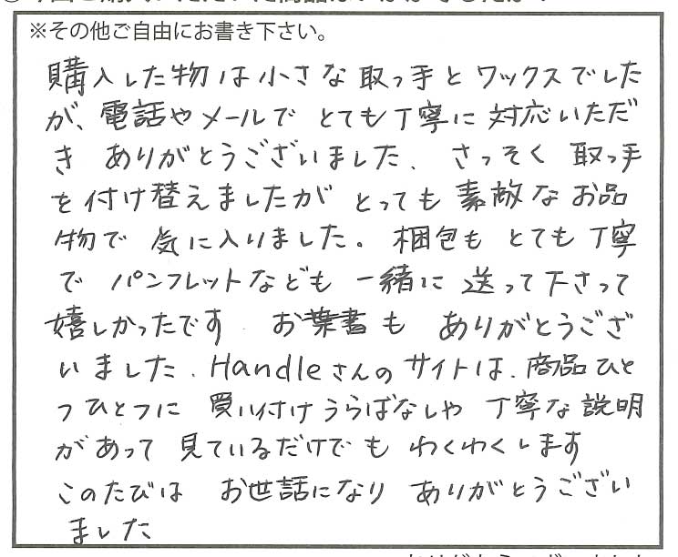 購入した物は小さな取っ手とワックスでしたが、電話やメールでとても丁寧に対応いただきありがとうございました。