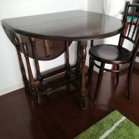 2回目の購入したアンティーク風の家具 マホガニ材を(象嵌と彫刻)が使われているテーブル、椅子はバルンチェアオーク材2脚セット。