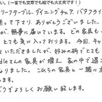 先日は、ドローリーフテーブル、ダイニングチェア、バタフライテーブル、キャビネットを送って下さり、ありがとうございました。 ご連絡が遅くなりましたが、無事に届いています。 どの家具もイメージ通りの重厚感があり、とても気に入...
