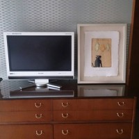 また配線用の穴を開けてもらったのですっきりと収まってます。引き出しの下が何もないタイプですので収納力は落ちますが、スツールがしまえます。ドゥロワーズの方は4段全てに鍵がかかりますし、天板に大きなものを飾ってもトレーが引き出せるのでちょっとしたものを置くことができます。