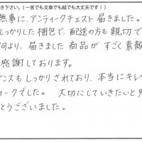 先日、無事に、アンティークチェスト届きました。とてもしっかりした梱包で、配送の方も親切で、そして何より、届きました商品がすごく素敵でとても感謝しております。