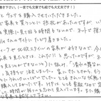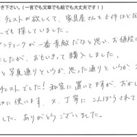 先日チェストをお送りいただきました。厳重に梱包されていたことにまず感動致しました。足にはしっかりとクッションが巻きつけられ板まで敷いていました。梱包を開ける時宝物が入っているようなワクワク感がありました。ホームページが素敵です。