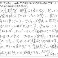 この度美容室を開業する事になり、おしゃれなお家の様なサロンにしたいと思い、御社での購入に至りました。アンティーク家具は彫刻が施されているのが好きです。色々WEBで見ましたが、ハンドルさんで扱われている商品はセンスが良く、女性のお客様に好かれそうだなと思ったのが購入の決め手です。また、サイトの見やすさや、電話対応、到着した商品の状態にも満足でした。ありがとうございました。