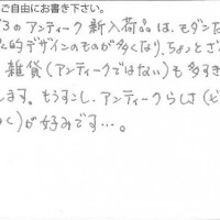 このごろのアンティーク新入荷品は、モダンなかんじの直線的デザインのものが多くなり、ちょっとざんねんです。 雑貨(アンティークではない)も多すぎるような気がします。もう少し、アンティークらしさ(ビンテージではなく)が好みで...