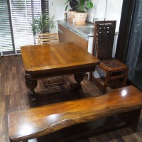 宮城県Fさまのアンティークテーブル「欅の長椅子との組み合わせて使っています。大切にしますよ♪」
