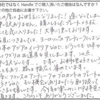昨日、無事にクリスマスリースとパールのブローチが届きました。とても丁寧な梱包と梱包された木村さんのメッセージ、会社のパンフレットやおまけにカレンダーまで!ありがとうございました!私はお店へ行くことが出来て、酒井さんの接客や倉庫で黙々と梱包作業をされている皆さんを目の当たりにしていたので、Handleさんの丁寧さ、誠実さをこの身にじわじわ感じていましたが、全国からネットと電話だけでやりとりをされている他のお客さん方にとって、商品が届いた時の”顔の見える接客”がどんなに嬉しいか、と感動してしまいました。(また、ダンボールのリサイクルについての考えにも賛同です。)