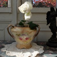 英国輸入の陶磁器、ロイヤルデホン(ROYALDEVON)の、魅力的なアンティークフラワーベースが届いています。 とても素敵で、バラ アイスバーグを挿して、アンティークレースの上に、ブロンズ像琴を弾く天使を添えて、撮ってみ...