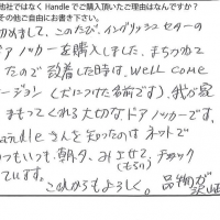 初めまして、このたび、イングリッシュセターのドアノッカーを購入しました。まちかねていたので到着した時は、WELL COMEサージョン(犬につけた名前です)。我が家をまもってくれる大切なドアノッカーです。Handleさんを知ったのはネットでいつもいつも、朝、夕、みさせてもらい、チェックしています。これからもよろしく。品物が沢山あるので。