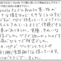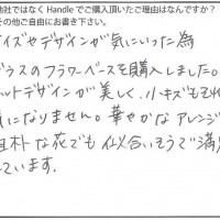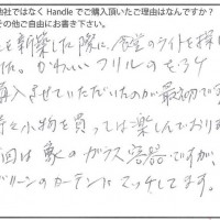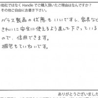 Handleさんでの初めての買い物が小さな燭台なので、大きなことは言えないのですが、HPで拝見していて、メンテナンスがきちんとされているようで、信頼できる印象がありました。実際、きれいな燭台でした。ペアで欲しかったのですが在庫がひとつで残念でした。毎日、HPで、ペンダントライトや飾り棚(食器棚?)を探しています。ありがとうございました。