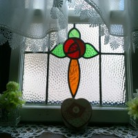 以前から憧れだったアンティークのステンドグラスを思い切って購入させていただきました。出窓のカーテンが少し邪魔をしていますが(笑)毎日眺めては楽しませて頂いております。見る角度によって色んな表情を見せてくれています。スタンドも一緒に購入したのですが奥行きが無くはみ出してしまい立て掛けているだけなのですが、安定しているのと適度な重みがあるので心配なく飾れてホッとしました。