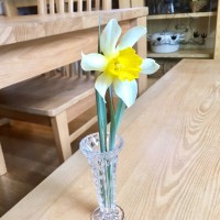 いつも素敵なものを、ありがとうございます☆仕切りのあるガラスのプレートは、ずっとこんなのを探していたので、とっても嬉しかったです☆簡単な竹輪の詰め物、プチトマト、切っただけのソーセージ、ゆでたエビ、買ってきた春巻きなど…:でもおいし美味しそうになるかな?一輪ざしには、庭に咲いてる水仙の花生けてみました☆