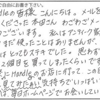 handleの皆様こんにちは。11月14日にメールを下さりありがとうございます。私はアンティーク家具は不安でまだ使ったことはありませんが、ステンドグラスはとてもステキでした。思わず、買ってすぐに2個目を買ってしまったくら...