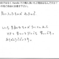いつも素敵な商品たのしみにしています。ハンドルさんから購入したものは他にもあるのです今回はこれくらいで。写真公開は恥ずかしいので一枚くらいにして下さい。大切に送ってくださるハンドルさんにお礼を込めて写真を撮りました。
