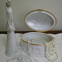フタ付きのガラスケースですが、母はベッドサイドに置いて時計や薬を入れています。私の方は見ているだけで美しいので、オブジェとして例のサイドボードの上に飾っています。どちらも即日では売れなかった記憶がありますが、中に入れるスペースが少ないと思っている方に、どれだけ素敵か教えてあげたいくらいです(笑)