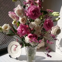 バラ模様の花器にバラ(&トルコキキョウ)を生けて、バラのコラボを楽しんでいます。