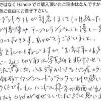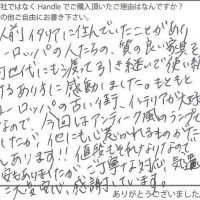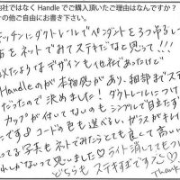 ペンダントライトが到着しまして1ヶ月経った今、すっかり馴染み、テーブルランプとして優しい光を味わっております。ありがとうございました。大変失礼かと存じますが、”お客様のお声”スペース上に切り取った写真紙を貼付させていただきました。八王子市の小さなパン屋のライトで円錐形アイアンシェードグラックでレトロ感いっぱいのライトです。もし、ハンドル様ネット画面で出会いましたらorderさせていただきたく思います。