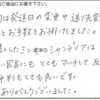 ありがとうございました。今回は発送日の変更や送り先変更等色々とお手数をお掛けしました。購入したミニシャンデリアは古い館にもとてもマッチして友人からの評判もとても良いです。 岐阜県岐阜市 T さま 【ご購入商品】照明・ライ...