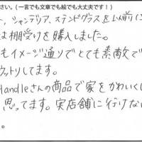 ブラケットライト、シャンデリア、ステンドグラスを以前に購入しており、今回は棚受けを購入しました。どの商品もイメージ通りでとても素敵で・・・見る度にウットリしてます。これからもHandleさんの商品で家をかわいくしていけたらいいなぁと思ってます。実店舗に行けないことが残念です。