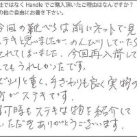 Handleさん、シャルドネのカップボードを紹介して下さって、ありがとうございました。そして御社の家具やインテリアに対するこだわりは、全てにおいて一貫性があり、その思いは顧客に対する対応にも現れています。とても信頼出来て、素晴らしいお店に出会えたと感じています。 近い将来、また御社で新たな家具(家族)にであい、引き取ることが出来ますように。 本当にありがとうございました。