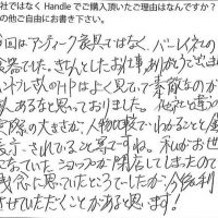 浅原様、丁寧な梱包をありがとうございました。 何日間も迷って買いましたが、とてもステキなランプでした。お店のホームページは、アンティーク家具への愛情がとても感じられて、説明なども親切だと思います。ぜひまたHandleさん...