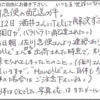 佐川急便の配達の件。7月12日酒井さんにTELして解決ずみです。(2個口がバラバラに配達された。)7月13日朝佐川急便さんより連絡あり。Handleさんから出荷された時点で別々の車に乗せられてしまったのこと。(佐川さんの...