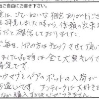 この度は、ごていねいな梱包ありがとうございます。HPを拝見しました時から、信頼の出来るお店だと確信しておりました。ほぼ毎日、HPの方はチェックさせて頂いています。届きました品物は全て大変キレイで大満足です。スタックマグとペアのポットの入荷が待ち遠しいです。アンティークは大好きですがなかなか購入する決心がつきません。