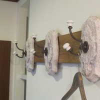 せっかくのステキなフックでしたので、もっと目立たせたくて(1つでも充分に存在感がありますが・・)ワトコオイルとブライワックスで色を付けた板に取り付けてみました。(ネジはネジ頭が 3.8mm の木ネジを使ってみました。)他のシンプルなフックと一緒に使ってもオシャレだと思いますし、白だけでなく、いろいろな壁とも合うと思います。