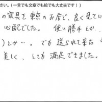 こんにちは、昨日無事にデスクが届きました。うっとりする、とっても素敵なデスクに大満足です。大切に使いたいと思います。これからも素敵な商品を楽しみにしていますね。