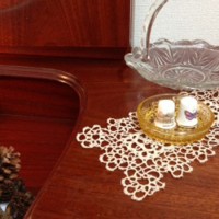 お世話になっております。今回のプレスドグラス(ベルとジャグ)も、とても素敵でした。どこに飾ろうか迷ったのですが……目立つようにリビングのサイドテーブルに飾らせて頂きました。ありがとうございました。
