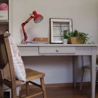 以前に購入したデスクをオリジナルペイントで塗り替えました。ホワイトだったのですが、下地の赤っぽい木目が見え隠れしてきたので、思い切りました。壁が白いので、うまく色が出ないのが残念ですが、淡いグレーに仕上がりました。匂いも...