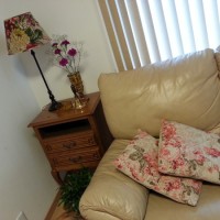 そして新入りなのに、この存在感!!昔からこの部屋にあったような感じです。ロイドルームに同じく猫足のアンティークベントサイドチェスト、テーブルランプにプレスドグラス、ステンドグラス、、、etc、、、我が家はほとんどHandleさんのもので埋め尽くされています(笑)。