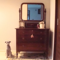 今では、あの時決めて良かったです!!本当にアンティークは 「出会い」 ですよね。我が家の愛犬も気になるようでチェストもまわりをウロウロ。イギリスに在住の親友に写メで送っちゃいましたーー。インテリア好きの友達も絶賛しておりました^^ベットの横に置こうかと思ったのですが圧迫感があったのでウォークインクローゼットの横に置きました。